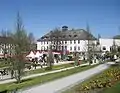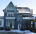 Вход на территорию старого здания железнодорожной станции города. Памятник архитектуры c 1984 года. Коттедж стиля фахверк с использованием природного камня.