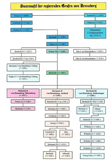 - Бертольд (1348—1378), линия пресеклась, владения унаследованы линией Хеннеберг-Ашах-Рёмхильд