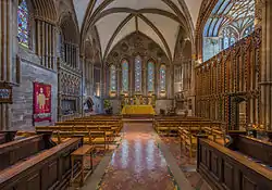 Хоры из трёх трёхъярусных секций наполнены произведениями искусства. Запрестольная перегородка (автор Коттингем младший) состоит из пяти отсеков, её скульптурное убранство представляет Страсти Христовы. Позади неё на колонку опирается пара стрельчатых арок, в пазухах которых современный барельеф Христа во славе в окружении ангелов и евангелистов, а ниже — король Этельберт. Статуя этого короля, откопанная около 1700 года при входе в капеллу Девы, выставлена в восточном конце южного бокового нефа. Также на хорах располагаются трон епископа, сорок мизерикордий XIV века и реставрированных, украшенных мифическими существами, гротесками и сценами повседневной жизни, и отдельные пять «Мест для судей», о которых неясно, использовались ли они в качестве мизерикордий или являются только украшениями.