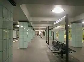Колонная трёхпролётная станция мелкого заложения. Последняя станция, спроектированная Райнером Герхардом Рюммлером. Путевые стены и колонны облицованы голубым кафелем. В некоторых участках стены кафелем не облицованы, и на голом бетоне под стеклом видны надписи времён Второй мировой войны. На станции три выхода, в центре и в торцах платформы. Средний выход совмещён с пересадкой на станцию внутригородской электрички.