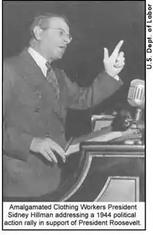Хилмен также считал, что профсоюзы должны политически мобилизовать своих членов. Они с Льюисом основали «Непартийную лигу труда» (Labor’s Non-Partisan League), проводившую кампанию за избрание Рузвельта в 1936 и 1940 году, хотя в последнем случае сам Льюис поддержал Уэнделла Вилки Хиллман был первым председателем Комитета политических действий КПП, созданного в 1942—1943 годах, а также Национального комитета политических действий граждан (NCPAC), который затем стал соучредителем Прогрессивной партии 1948 года[14]. На последних выборах Рузвельта в 1944 году Хилмен собрал почти 1 миллион долларов США на его кампанию.