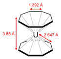 Синтезирован также ураноцен [бис(циклооктатетраен)уран], в котором атом урана удерживает два восьмичленных кольца (рис.10). Все 16 связей уран-углерод в ураноцене идентичны. Ураноцен получают взаимодействием UCl4 со смесью циклооктатетраена и калия в тетрагидрофуране при минус 300 C.[9]