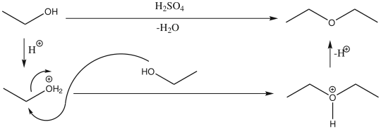 При осторожном нагревании в присутствии серной кислоты происходит межмолекулярная дегидратация спиртов с образованием простых эфиров[36]: