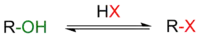 Одной из наиболее важных реакций с участием связи C−O является превращение спиртов в галогеноалканы. Гидроксильная группа в спиртах может быть замещена на атом галогена несколькими способами[2]: