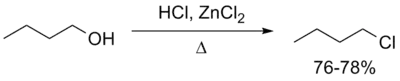 Реакции третичных спиртов с HCl протекают достаточно легко. При этом образуются соответствующие третичные алкилхлориды (совместно с продуктами побочных реакций). Первичные и вторичные спирты реагируют гораздо медленнее и требуют применения катализатора. Обычно используется так называемый реагент Лукаса, представляющий собой смесь HCl и ZnCl2[4][7].