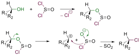 В зависимости от условий взаимодействие спиртов с SOCl2 протекает либо по механизму SNi, либо по механизму SN2. В обоих случаях спирт превращается в соответствующий алкилхлорид.