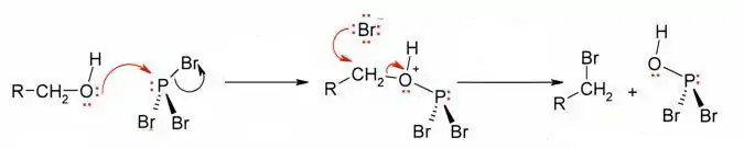 Распространённым способом превращения спиртов в алкилгалогениды является их взаимодействие с галогенидами фосфора: РВr3, РСl5, РОСl3 или РI3 (образуется непосредственно в ходе реакции). Реакция протекает по нуклеофильному механизму с образованием галогенфосфита в качестве интермедиата[10]:[стр. 142—143]: