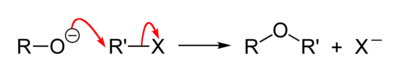 В отличие от спиртов, являющихся слабыми нуклеофилами, алкоголяты, образующие алкоксид-ионы RO− — сильные нуклеофилы и легко реагируют с алкилгалогенидами по механизму SN2 с образованием простых эфиров[34]: