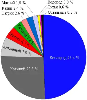 Из химических элементов наиболее распространены в земной коре кислород и кремний. Эти элементы вместе с элементами алюминий, железо, кальций, натрий, калий, магний, водород и титан составляют более 99 % массы земной оболочки, так что на остальные элементы приходится менее 1 %. В морской воде, помимо кислорода и водорода — составных частей самой воды, высокое содержание имеют такие элементы, как хлор, натрий, магний, сера, калий, бром и углерод. Массовое содержание элемента в земной коре называется кларковым числом или кларком элемента.