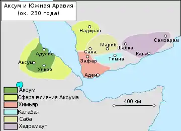 В III веке химьяриты последовательно подчинили территорию Катабана (завоёванную перед этим Хадрамаутом), Сабу, а в IV веке — Хадрамаут и стали называть себя царями Саба' и зу-Райдана и Хадрамаута и Йаманата, то есть всего Йемена. В IV веке здесь, видимо, происходили смуты. В распрю тогда вмешались эфиопские цари, которые около 340 года вторглись в страну и захватили часть юга Аравийского полуострова.