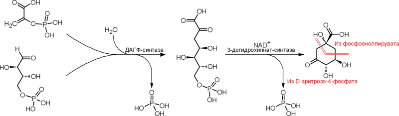 Исходными соединениями для биосинтеза хинной кислоты служат фосфоенолпировиноградная кислота и d-эритрозо-4-фосфат, которые под действием фермента образуют 3-дезокси-d-арабино-гепт-2-улозонат-7-фосфат (ДАГФ), после чего происходит отщепление фосфатного остатка и циклизация в 3-дегидрохинную кислоту, из которой затем получается хинная кислота. Данная схема, являющаяся частью шикиматного пути, доказана для микроорганизмов, однако в высших растениях также были обнаружены ферментные системы, предназначенные для осуществления данной схемы[2].