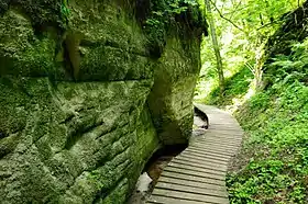 Каньон начинается северо-восточнее озера Кахрила, где ручей встречается с толщей среднедевонских песчаников гауйской свиты живетского яруса. На поверхностях обнажений можно встретить окрашенные в более тёмные цвета слои с большим содержанием оксидов железа, а также кварцевые прожилки. Первые 50 м длины характеризуются извилистостью и большей шириной, далее ущелье спрямляется и сужается[4].