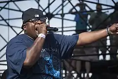 Исполнение рэпа, также называемое MC’инг или эмсиинг, — это вокальный стиль, в котором артист говорит лирически и ритмично, в рифмах и стихах, как правило, под инструментальный или синтезированный бит. Биты, почти всегда в тактовом размере 4/4, могут быть созданы продюсером путём семплирования и/или секвенирования частей других песен[71]. Биты также включают синтезаторы, драм-машины и живые выступления групп. Рэперы могут писать, запоминать или импровизировать свои тексты и исполнять свои произведения а капелла или в такт. Хип-хоп-музыка предшествовала введению исполнения рэпа в хип-хоп-культуру, и рэп-вокал отсутствует во многих хип-хоп-треках, таких как «Hip Hop, Be Bop (Don’t Stop)» Мэна Пэрриша; «Chinese Arithmetic» группы Eric B. & Rakim; «Al-Naafiysh (The Soul)» и «We’re Rocking the Planet» Хашима; и «Destination Earth» группы Newcleus. Тем не менее, большая часть этого жанра сопровождалась рэп-вокалом, например, электро-хип-хоп-группа Warp 9, созданная под влиянием научной фантастики[72]. Женщины-рэперы появились на сцене в конце 1970-х — начале 80-х, в том числе артистка из Бронкса MC Sha-Rock, участница группы Funky Four Plus One, ставшая первой женщиной-MC[73], и The Sequence, хип-хоп-трио, подписавшее контракт с Sugar Hill Records, первая женская группа, выпустившая рэп-запись „Funk You Up“.