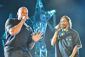 После того, как N.W.A. распались, бывший участник Dr. Dre выпустил The Chronic в 1992 году, который занял 1-е место в R&B/хип-хоп-чарте[151], 3-е место в поп-чарте и породил сингл «Nuthin 'but a 'G' Thang», занявший 2-е место в поп-чарте. The Chronic поместил рэп Западного побережья в новое направление[152], находясь под сильным влиянием Пи-Фанковых исполнителей, сочетая плавные и легкие фанк-биты с медленно протяжной лирикой. Это стало известно как джи-фанк и хип-хоп доминировал в мейнстриме в начале-середине 1990-х благодаря списку артистов на лейбле Шуга Найта Death Row Records, включая Тупака Шакура, чей двойной альбом All Eyez on Me стал большим хитом с песнями «Ambitionz az a Ridah» и «2 of Amerikaz Most Wanted», и Snoop Doggy Dogg, чей Doggystyle включал такие хиты, как «What’s My Name?» и «Gin and Juice»[153]. Поскольку лейбл Death Row в Лос-Анджелесе построил империю вокруг Дре, Снупа и Тупака, он также вступил в соперничество с нью-йоркским лейблом Bad Boy Records, возглавляемым Puff Daddy и The Notorious B.I.G.
