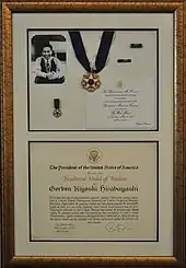 27 апреля 2012 года президент США Барак Обама посмертно наградил Хирабаяси Президентской медалью Свободы за его принципиальную позицию против интернирования американцев японского происхождения.[11] 29 мая состоялась встреча президента и членов семьи Гордона Хирабаяси. 22 февраля 2014 года медаль была официально передана в дар Университету штата Вашингтон и хранится в Библиотеке специальных коллекций, где находится архив Хирабаяси.