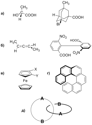 В зависимости от элемента молекулы, наличие которого приводит к возникновению хиральности, различают следующие виды хиральности: