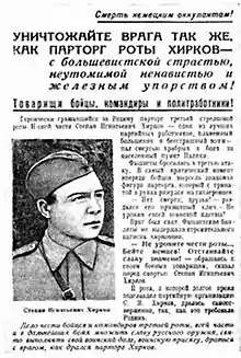 Товарищи бойцы, командиры и политработники! Героически сражавшийся за Родину парторг третьей роты Н-ской части С. И. Хирков — один из лучших партийных работников, пламенный большевик и бесстрашный воин — пал смертью храбрых в боях за населённый пункт Палики. Коммунист С. И. Хирков оправдал доверие народа, пославшего его защищать честь и свободу Родины, оправдал доверие партии большевиков, совершив в последнем бою поистине бессмертный подвиг. Каждый воин Красной Армии должен быть таким, как Хирков – храбрым, отважным, не знающим страха в борьбе. Вперёд, товарищи! Приближайте час победы!