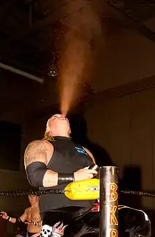 Хит изображает готического, вампирического персонажа по имени Гангрел, который плевался «кровью» перед матчами- Командный чемпион APW (1 раз) — с Билли Блейдом[4]