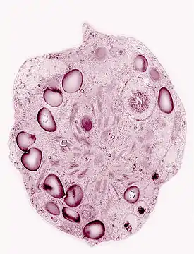 ![]() Срез клетки, визуализированный средствами трансмиссионной электронной микроскопии (окраска добавлена при цифровой обработке) | ||||||||||||||