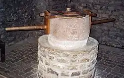 | Реконструированные ручные жернова I века н. э. | Пекарня и мельница в Остии | Ручная мельница из твёрдого песчаника из Августа-Раурика. Вес подвижной части около 200 кг. В ходе эксперимента было установлено, что на такой мельнице возможно намолоть до 25 кг муки в час[40] | Реконструкция мельницы в археологическом парке в Ксантене. | Водяные мельницы были известны уже в начале I века н. э. Реконструкция по планам Витрувия |