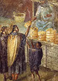 В Древнем Риме не существовало разделение профессий мельника и пекаря[11][К 4]. Пекаря называли pistor[К 5], название, напоминавшее о более древнем способе приготовления муки — в ступке[37]. На крестьянских дворах по-прежнему хлеб, а скорее лепёшки, выпекала хозяйка. Богатые граждане держали своих пекарей, которые выпекали особые сорта хлеба. При императорском доме также состояли пекари, во главе которых был «управитель пекарями», контролёры проверяли качество хлеба и его вес. Зачастую пекарями становились вольноотпущенные рабы.