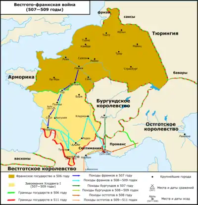 Выдающимся политическим событием в правление Хлодвига был захват в 507—508 большей части вестготского государства в Галлии союзными франками и бургундами. В этой войне Хлодвига поддерживали и рипуарские франки Сигиберта Хромого. Король остготов Теодорих Великий пытался в письмах и через послов, которых он направлял королям вестготов, бургундов, западных герулов, варнов и прирейнских тюрингов, а также самому Хлодвигу, сохранить мир и равновесие германских королевств в Западной Европе, но Хлодвиг не шёл ни на какие переговоры. Вероятно, его подстрекала к быстрому нападению на вестготов и византийская дипломатия, ибо успех Хлодвига означал одновременно ослабление политического положения Теодориха Великого.