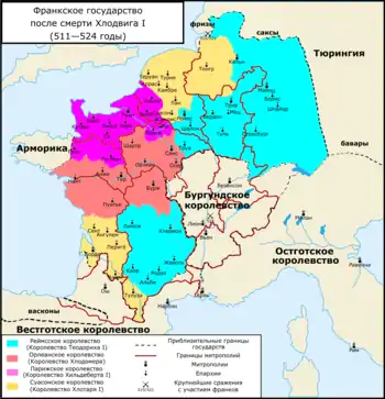 После смерти Хлодвига королевство было поделено между его четырьмя оставшимися в живых сыновьями: Теодорихом I, Хлодомиром, Хильдебертом I и Хлотарём I. По смерти своего мужа королева Клотильда Бургундская удалилась в Тур и там, укрывшись в базилике святого Мартина, провела остаток дней в добродетели и милосердии, редко посещая Париж. Умерла она в 544 году в Type. Тело доставили в Париж, там она была погребена своими сыновьями, королями Хильдебертом и Хлотарём, в церкви святых Петра и Павла, рядом с королём Хлодвигом[44].
