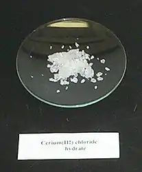 Хлорид церия(III) — бинарное неорганическое соединение, соль металла церия и соляной кислоты с формулой CeCl3, бесцветные кристаллы, растворимые в воде, образует кристаллогидрат.