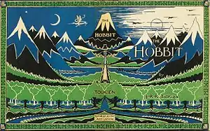 В июле 1937 года Толкин представил издательству собственные проекты обложки и суперобложки для книги[86]. Рисунок для обложки включает в себя изображения дракона, гор, солнца и луны. Две руны ᚦ (TH) обозначают имена королей Трора и Траина, а руна ᛞ (D), предположительно, указывает на прародителя гномов Дурина. Суперобложка даёт читателю представление о месте действия книги — на ней изображены горы, лес, город на Долгом озере, Одинокая Гора, дракон и орлы. Одновременное присутствие на небе солнца и луны указывает на день Дурина, во время которого появлялась возможность открыть потайную дверь в Одинокой Горе. Обрамление суперобложки выполнено в виде надписи англосаксонскими рунами: «„Хоббит, или Туда и обратно“ — сочинение Бильбо Бэггинса из Хоббитона о его путешествии, длившемся год, — обработано на основе его воспоминаний Дж. Р. Р. Толкином и опубликовано George Allen and Unwin Ltd.». Оба проекта издательством были приняты[87][39].