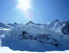 ![]() Хобергхорн (справа), Штекнадельхорн (в центре) и Надельхорн (слева), вид с северной стороны массива Надельграт | |