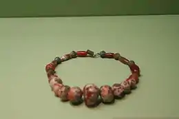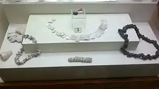![]() Агатовые бусы с клинописью, обнаруженные в Ходжалы. Поздняя бронза — раннее железо. Музей истории Азербайджана (Баку) | |