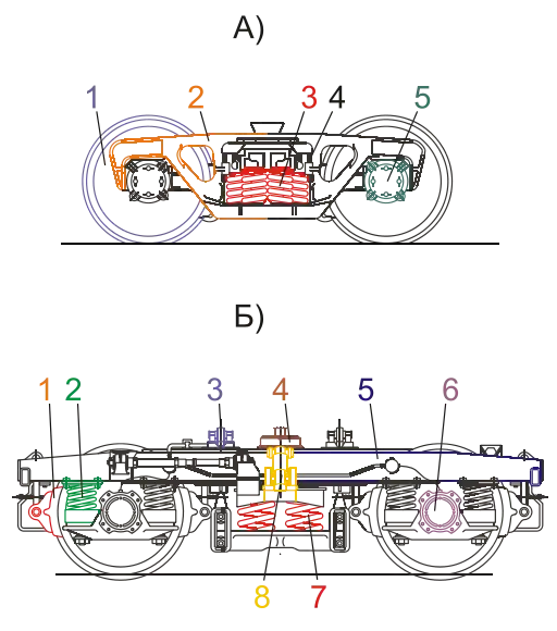б) — типа КВЗ-ЦНИИ пассажирского вагона: 1 — тормозная колодка; 2 — буксовое рессорное подвешивание; 3 — скользун; 4 — подпятник; 5 — рама; 6 — букса; 7 — центральное рессорное подвешивание; 8 — гаситель колебаний.