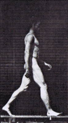 - Я. И. Перельман, цитируя «Лекции по зоологии» Поля Бера, описывает ходьбу как «последовательность управляемых падений»[1]. При каждом шаге человек наклоняется вперед и начинает падение, которому препятствует выдвинутая вперёд нога. После того как она касается земли, на неё переносится вес тела, колено подгибается, амортизируя падение, и выпрямляется, возвращая тело на исходную высоту. Таким образом, человек ненадолго выводит себя из состояния равновесия, смещая вперед свой центр тяжести и затем, посредством вытянутой вперед ноги, возвращается в исходное положение.