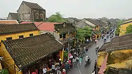 Согласно описанию китайского буддийского монаха Ши Дашаня, посетившего Хойан весной 1695 года по дороге ко двору Нгуенов в Хюэ, город представлял собой оживлённый порт, куда съезжались купцы со всей Азии. Главная торговая улица длиной около четырёх ли (современные улицы Чанфу и Нгуензуйхьеу) шла вдоль реки Тхубон и была застроена с обеих сторон зданиями, в которых жили выходцы из Южного Китая — фуцзяньцы, гуандунцы (кантонцы), чаочжоусцы и хайнаньцы. Улица заканчивалась у Японского моста, за которым раскинулся район Камфо. На другом берегу пришвартовывались иностранные корабли, с которых различные товары выгружались на пристань[20].