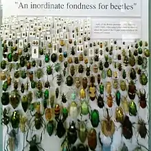 - Широко известен ответ Холдейна (возможно апокрифический) на вопрос богословов о том, какие черты Творца можно обнаружить, изучая природу. Он ответил: «Неумеренная любовь к жукам» (An inordinate fondness for beetles).[12] Это отсылка к тому факту, что в отряде жесткокрылых, или жуков, насчитывается более 400 000 видов, что составляет 40 % всех известных видов насекомых (а во времена Холдейна — более половины видов насекомых).[13] Таким образом жуки — самый многочисленный отряд животных; число видов жуков превосходит число видов млекопитающих в 72 раза.