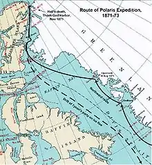 3 июля 1871 года экспедиционное судно «Поларис» вышло из Нью-Йорка, через Девисов пролив вошло в море Баффина и, следуя вдоль западных берегов Гренландии, вышло через пролив Смита между Гренландией и островом Элсмир в Северный ледовитый океан. 30 августа «Поларис» достиг рекордной на то время широты 82°11'. Чарльз Холл, как руководитель экспедиции, был готов идти до конца, но капитан корабля Сидни Бадингтон (капитан судна «Джордж Генри» экспедиции Холла 1860 года) был крайне обеспокоен вероятностью быть запертым льдами в море, которое Холл назвал в честь президента США морем Линкольна, и Холл согласился повернуть назад. После долгих поисков безопасной гавани «Поларис» встал на зимовку на 81° 36' северной широты в бухте, которую назвали «Бухта Благодарения» (англ. «Thank God Harbor»)[10].