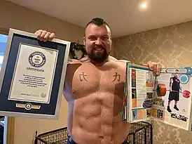 - Становая тяга — 500 кг с использованием лямок и комбинезона[1]