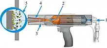 3 — порошковый материал, представляющий собой механическую смесь металлических и керамических частиц, подаётся в сверхзвуковой поток воздуха за критическим сечением сопла, в ту его часть, где давление в потоке несколько ниже атмосферного давления;