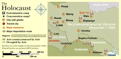 На территории Украины было уничтожено наибольшее количество евреев из граждан Советского Союза — примерно половина всех жертв Холокоста, являвшихся на момент начала Великой Отечественной войны гражданами СССР[2]. Только в Бабьем Яре, согласно отчёту зондеркоманды-4а, был расстрелян 33 771 еврей. Как оценили украинские исследователи, всего в Бабьем Яре погибло около 150 000 евреев, включая жителей других украинских городов и беженцев.[3]. По другим данным, 850 000—900 000 евреев, которые жили на территории современной Украины[4][5]. Общее количество убитых украинских евреев (с учётом убитых в плену и эвакуации на территории оккупированной России) А. И. Кругловым и Д. Полем оценивается в 1,5—1,6 млн человек[6][7], то есть каждая четвёртая жертва Холокоста проживала на территории современной Украины. Важным фактором, влиявшим на уничтожение такого большого количества евреев, было участие части местного населения, в том числе организаций украинских националистов[2].