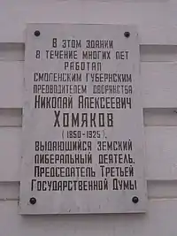 Николай Алексеевич Хомяков (1850, Москва, Российская империя — 1925, Дубровник, Королевство СХС) — государственный деятель Российской империи, член Государственной думы II, III и IV созывов от Смоленской губернии. Председатель Государственной думы III созыва (1907—1910). Действительный статский советник (1895).
