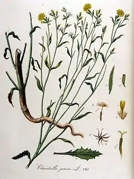 ![]() Хондрилла ситниковидная. Ботаническая иллюстрация из книги Яна Копса Flora Batava, 1800—1934 | ||||||||||||