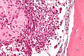 ![]() Микрофотография хондробластомы. Окрашено гематоксилином и эозином | |