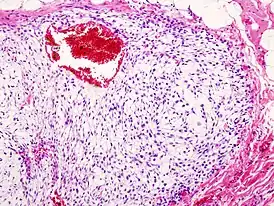![]() Гистограмма хондромы стенки грудной клетки. Окрашено гематоксилином и эозином. | |
