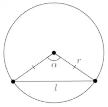 - Длина хорды равна , где — радиус окружности, — центральный угол, опирающийся на данную хорду (рис. 2).