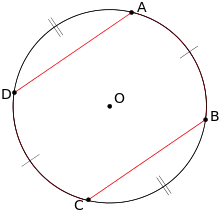 - Если хорды параллельны, то дуги, заключённые между этими хордами (не путать с дугами, стягиваемыми хордами), равны.