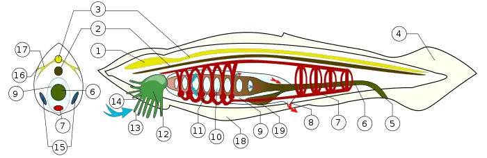 - Мышечный хвост — постанальный отдел тела, расположенный каудальнее смещённого на брюшную сторону тела ануса (в него заходят хорда и нервная трубка, но не заходит кишечник).