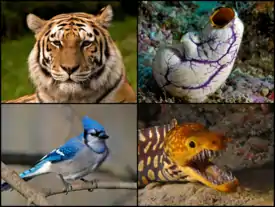 ![]() 1-й ряд: тигр и асцидия Polycarpa aurata 2-й ряд: голубая сойка и Enchelycore anatina | ||||||||||||