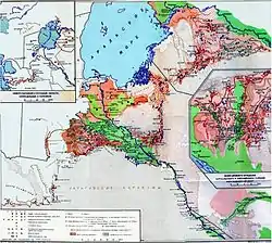 Позднее работы приняли большой размах и развернулись на новой методической основе. Хорезмская экспедиция стала одной из самых выдающихся и наиболее оснащённых археологических экспедиций в СССР, здесь впервые велась узкопрофильная работа на разных уровнях и с использованием широкого спектра техник и методов[4]. Раскопки проводились в низовьях Амударьи и Сырдарьи, пустынях Каракумы и Кызылкум на территориях, которые теперь принадлежат Узбекистану, Туркмении и Казахстану[5]. В составе экспедиции порой трудилось до восьми отрядов, которые в поисках артефактов буквально перебрали по камешку гигантскую территорию.