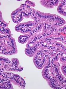 Микроскопически хориоидпапиллома представлена ворсинками различной формы и величины, покрытыми цилиндрическим эпителием, сходным по своим характеристикам с нормальным эпителием сосудистых сплетений. В редких случаях он располагается многослойно. Строма ворсинок состоит из рыхлой соединительной ткани, которая окружает тонкостенные сосуды. В некоторых ворсинках может обнаруживаться плотная соединительная ткань со значительным числом сосудов. Также в них возможны отложения солей кальция, гиалиноз, отёк и фиброз[1].