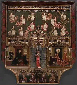 Об алтаре впервые упомянул в своей книге «Путешествие по Испании» (исп. «Viage de España») историк искусства, художник и путешественник Антонио Понс. Он посетил Буйтраго-дель-Лосойя в 1787 году. Тогда алтарь состоял из 1) панели, изображающей святого Георгия (утрачена), 2) ныне утерянного первоначального образа святой Богородицы, который приобрёл маркиз в Медине (историки искусства предполагают, что это была работа фламандского мастера середины XV века[7]), 3-4) двух панелей с хорами ангелов и 5—6) ещё двух — с молитвенными фигурами роскошно одетых маркиза (это единственное сохранившееся до нашего времени его портретное изображение[7]) и его жены, Каталины Суарес де Фигероа (1400—1455), за которыми находятся паж и служанка (через окно и дверь комнат, в которых они находятся, открывается ландшафт), а также пределлы с поясными изображениями Отцов Церкви (на ней представлены четыре богослова ранней Западной Церкви: святой Григорий Великий, святой Иероним Стридонский, блаженный Августин и святой Амвросий Медиоланский[8]). «Это не алтарь, который предназначается для литургического использования. Несмотря на то, что он посвящен Святой Деве, героями его являются маркиз и его жена, стоящие на коленях перед Девой», — утверждает Пилар Сильва, заведующий отделом живописи Северной Европы (1400—1600) и испанской живописи (1100—1500) в музее Прадо[9].